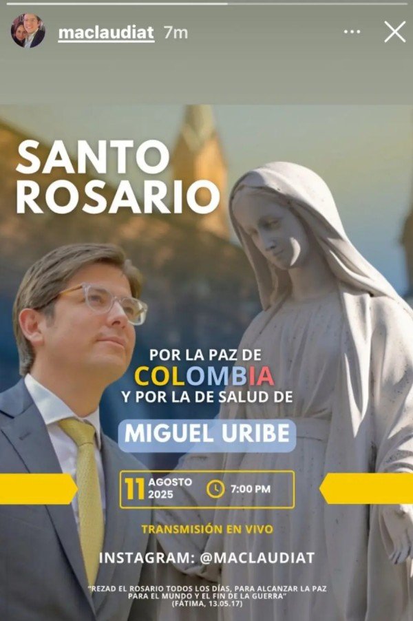 “Quiero convocar a todos los colombianos para unirnos a través de la oración y pedir por la unión y la paz de Colombia. Para Miguel, su propósito y causa de vida es un país en paz y hoy él nos necesita unidos para honrar su lucha y para pedir por su completa sanación. Este lunes 11 a las 7:30 p. m., unámonos para rezar el rosario, con fe y con esperanza para honrar la lucha de Miguel y para pedir por su completa sanación”, publicó.