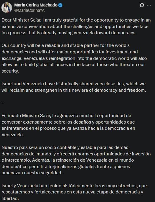 La líder opositora resaltó los lazos históricos entre Israel y Venezuela, y aseguró que en una futura etapa democrática esos vínculos «serán fortalecidos y ampliados, con un enfoque en cooperación, seguridad y desarrollo económico».